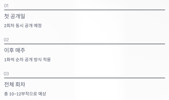 | 공개 방식 | 첫주 2화, 이후 매주 1화씩 공개 |