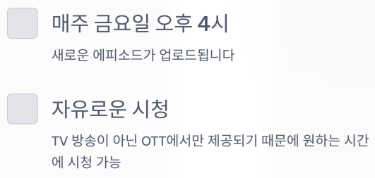 OTT에서만 제공되기 때문에 원하는 시간에 자유롭게 시청할 수 있다는 점이 가장 큰 장점이죠.