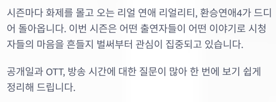 시즌마다 화제를 몰고 오는 리얼 연애 리얼리티, 환승연애 4가 드디어 돌아옵니다.