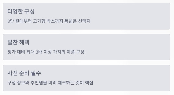 3만 원대 구성부터 고가형 박스까지 다양하게 출시된 만큼, 구성 정보와 추천템을 미리 알고 준비하는 게 핵심입니다.