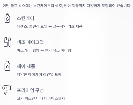 이번 블프 박스에는 다양한 스킨케어, 색조, 헤어 제품까지 포함되어 있어요.