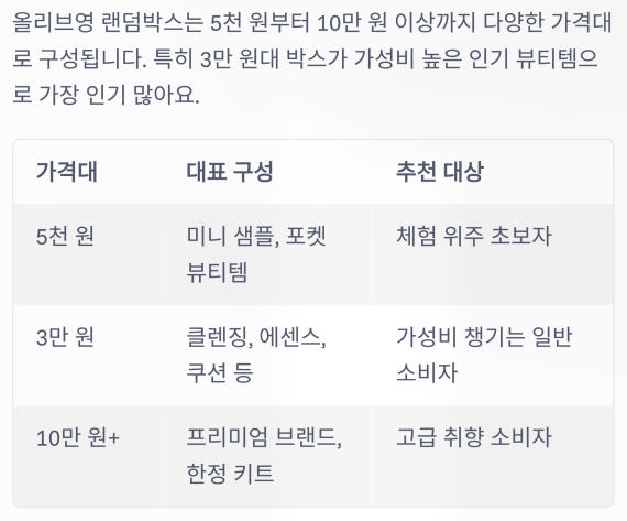 올리브영 랜덤박스는 3만 원, 5천 원, 10만 원 등 다양한 가격대로 나뉩니다.