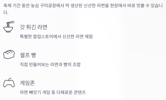 라면 상상 창작소, 라면 게임장, 포토존, 쉼터 등 다채로운 공간이 마련돼 가족 단위 방문객들에게도 추천해요.