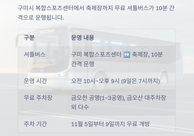| 셔틀버스 | 구미 복합스포츠센터 ↔ 축제장, 10분 간격 운행 |