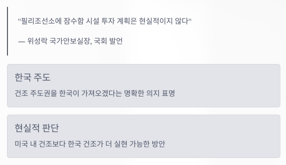 위성락 국가안보실장은 국회에서 "필리조선소에 잠수함 시설 투자 계획은 현실적이지 않다"라고 밝혔습니다.