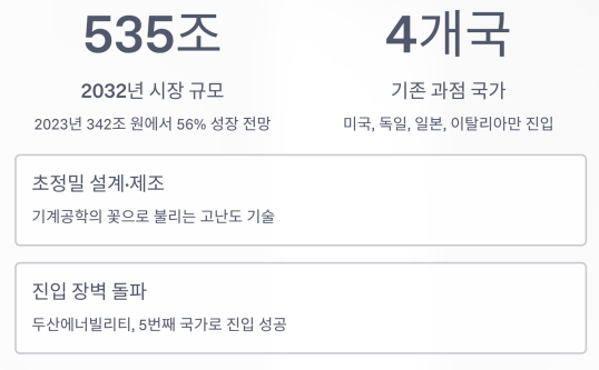 | 진입 장벽 | 고정밀 설계·제조가 필요한 ‘기계공학의 꽃’ |
