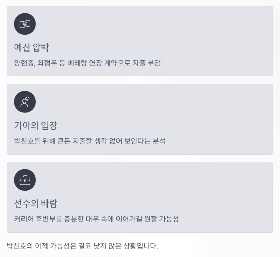 | 선수 본인의 의지 | SNS 행보, 타도시 방문 등 이적 가능성 암시 |