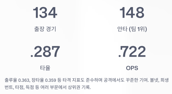 출루율 0.363, 장타율 0.359, OPS 0.722 등 타격 지표도