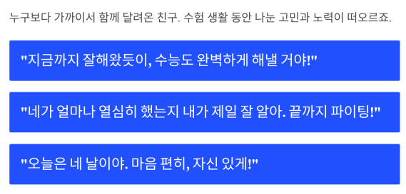 | 후배에게 | “수능은 네 인생의 전부가 아니야.” |