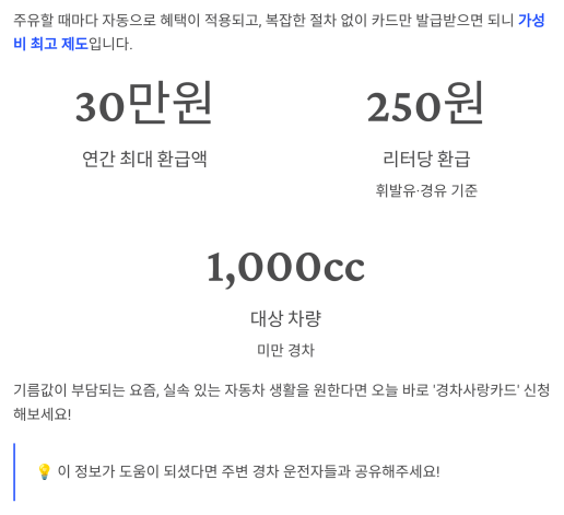 실속 있는 자동차 생활을 원한다면 오늘 바로 ‘경차사랑카드’ 신청해 보세요.
