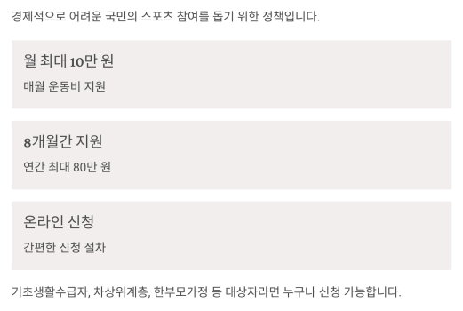 돕기 위한 정책으로, 신청만 하면 월 최대 10만 원씩 8개월간 운동비를 지원받을 수 있습니다.