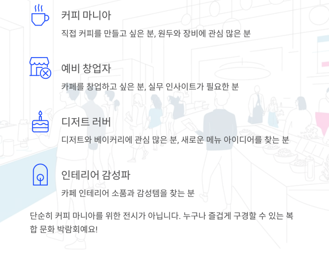 커피를 사랑하는 일반 관람객부터, 카페 창업을 꿈꾸는 예비 사장님들,