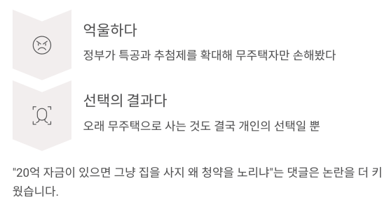 하나는 "정부가 특공과 추첨제를 확대해 무주택자만 손해 봤다"는 입장이고,