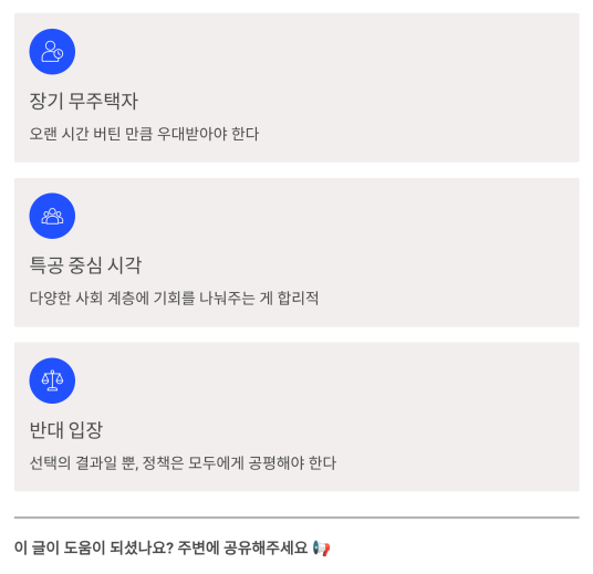| 반대 입장 | 선택의 결과일 뿐, 정책은 모두에게 공평해야 한다 |