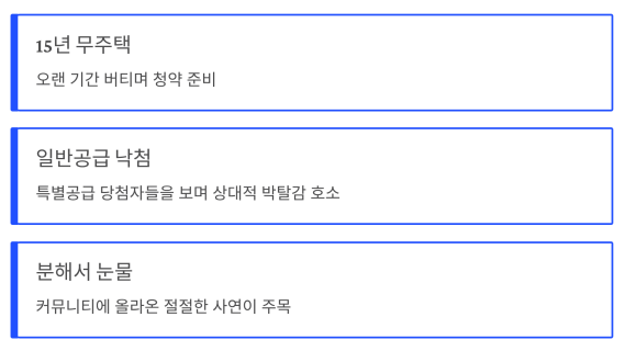 15년 넘게 무주택을 유지하며 청약만 바라본 사람들의 절절한 글들이 커뮤니티를 통해 확산되면서,
