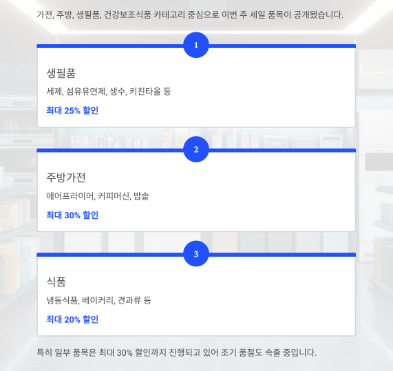 가전, 주방, 생필품, 건강보조식품 카테고리 중심으로 이번 주 세일 품목이 공개됐습니다.