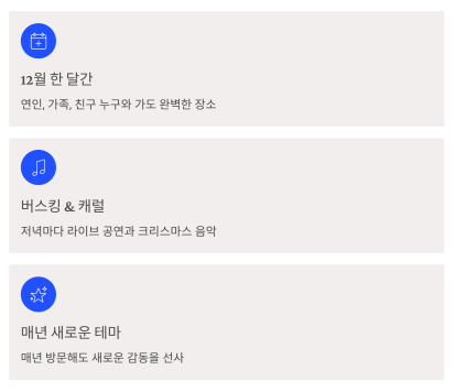 | 실내 공간 | 크리스마스 테마 체험존, 푸드존 운영 |