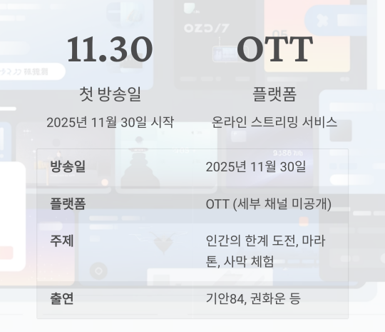 공식 발표에 따르면, ‘극한 84’는 2025년 11월 30일 첫 방송을 시작으로