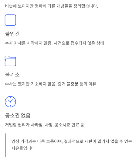 | 불기소 | 수사는 했지만 기소하지 않음 (증거 불충분 등) |