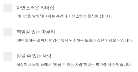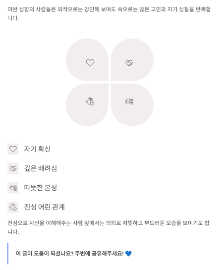 | 일 | 성과 중심, 목표 지향적이며 성실함 | 일에 몰두하다 보면 피로감이 누적될 수 있음 |