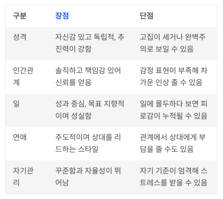 | 성격 | 자신감 있고 독립적, 추진력이 강함 | 고집이 세거나 완벽주의로 보일 수 있음 |