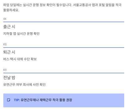 | 퇴근 | 버스·택시 대체 수단 확보 |