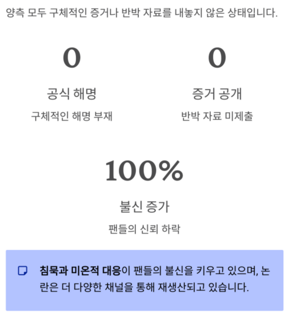 이런 침묵과 미온적 대응이 팬들의 불신을 키우고 있으며,