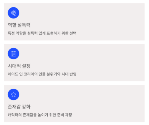 | 작품 맥락 | 메이드 인 코리아 캐릭터 몰입 |