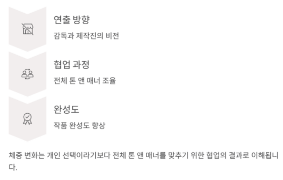 체중 변화는 개인 선택이라기보다 전체 톤 앤 매너를 맞추기 위한 협업의 결과로 이해됩니다.