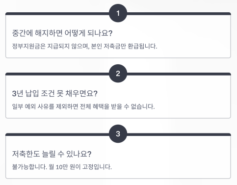 → 정부지원금은 지급되지 않으며, 본인 저축금만 환급됩니다. - 3년 납입 조건 못 채우면요?