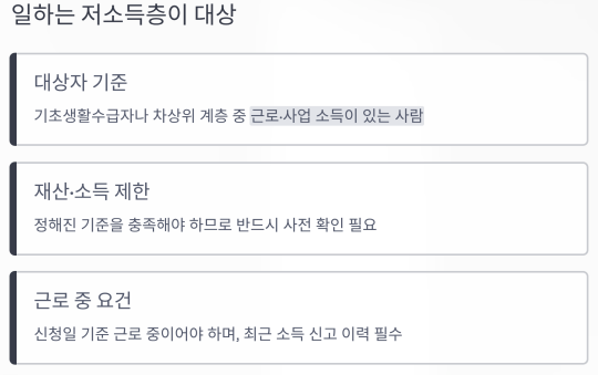 기초생활수급자나 차상위 계층 중 근로·사업 소득이 있는 사람이 대상입니다.