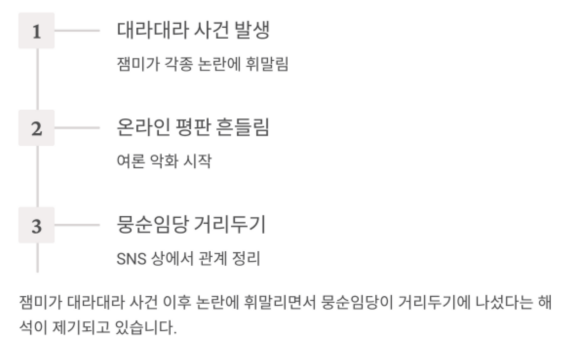 | 언팔 여부 | 뭉순임당 언팔 진행 | 잼미 언팔 여부 불명확 |
