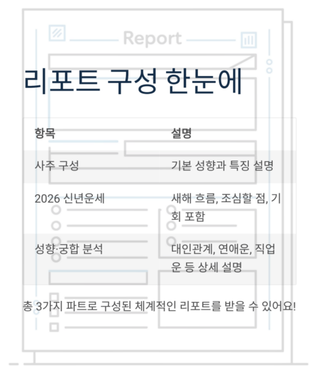 사주 리포트는 총 3가지 파트로 나뉘어 있었어요.