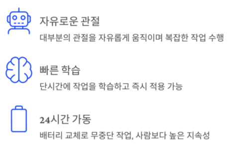 | 주요 기능 | 24시간 가동, 고관절 기동성, 빠른 작업 학습 |