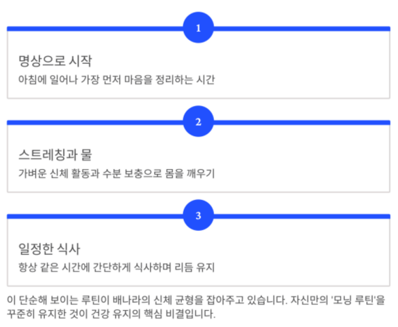| 운동 루틴 | 아침 스트레칭, 주 3회 근력 운동 |