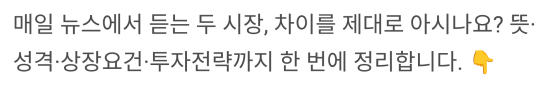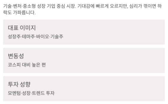 - 코스닥: 성장 스토리/테마/모멘텀이 주가를 끌어올리는 경우가 많음