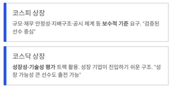 - 코스피 상장: 대체로 규모·재무 안정성·지배구조·공시 체계 등에서 더 “보수적” 기준을 요구하는 편