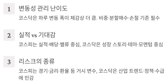 3) 코스피 vs 코스닥 차이, 표로 10초 컷