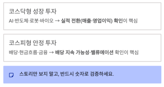 - 빠른 성장 구간을 노려보고 싶다 → 코스닥도 가능(단, 비중·손절 기준 필수)