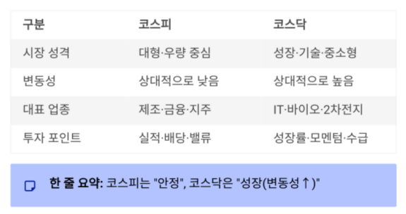 한 줄 요약: **코스피는 “안정”, 코스닥은 “성장(변동성↑)”**에 가깝습니다.