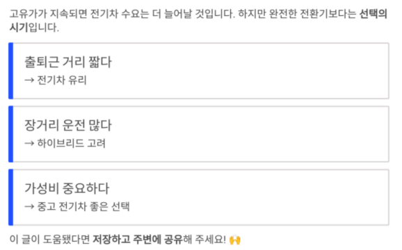 - 가성비 중요 → 중고 전기차 좋은 선택