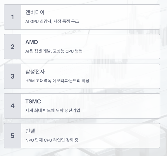 | 엔비디아 | AI GPU 최강자, 시장 독점 구조 |