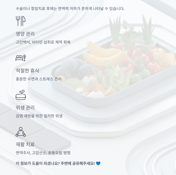 수술이나 항암치료 후에는 면역력 저하가 흔하게 나타날 수 있습니다.