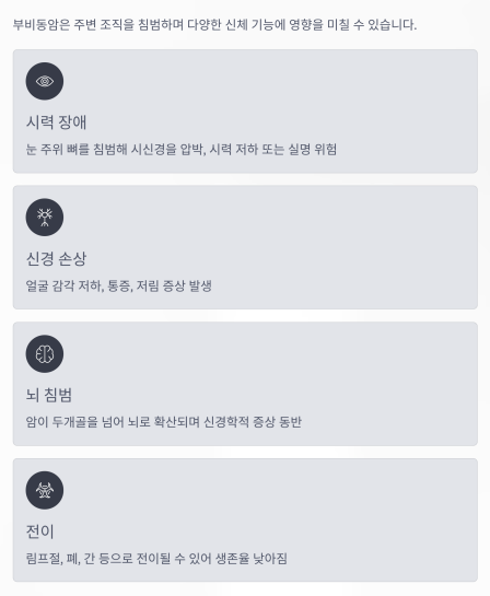 | 시력 장애 | 눈 주위 뼈를 침범해 시신경을 압박, 시력 저하 또는 실명 위험 |