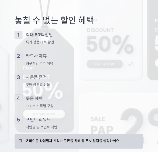 특히 온라인몰에서는 타임딜, 선착순 쿠폰 등 한정 혜택이 자주 열리니 앱 푸시 알림 설정도 추천드립니다.