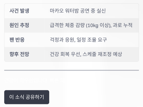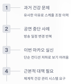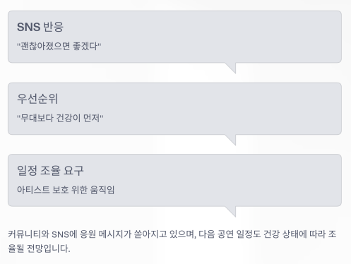 | 팬 반응 | 걱정, 응원, 일정 조율 요구 |