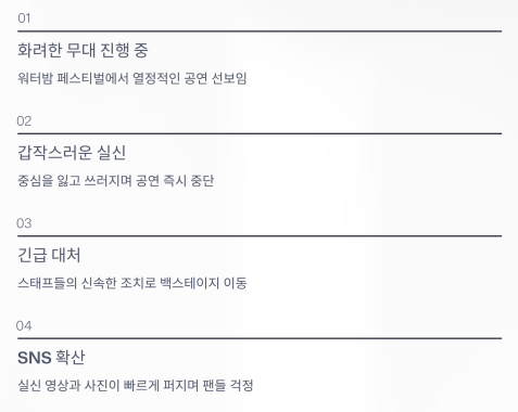현장에 있던 스태프들이 신속하게 대처하며 공연은 즉시 중단됐고,
