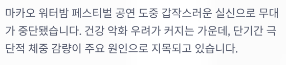 다음 공연 예정지에서도 건강 회복 여부에 따라 스케줄이 조율될 가능성이 있어 보입니다.