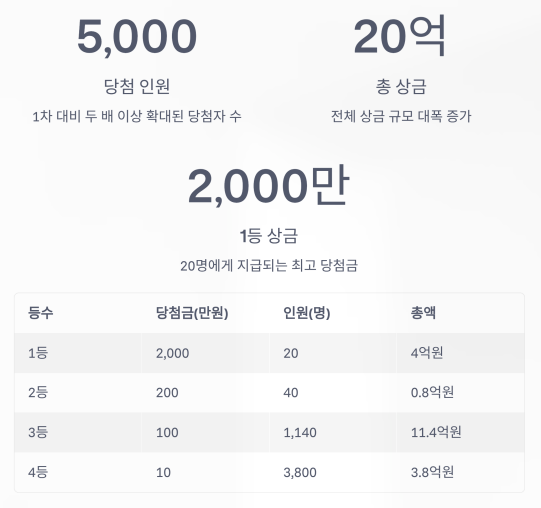 그런데 이번 2차는 무려 5,000명 당첨, 총 상금 20억 원으로 확대!