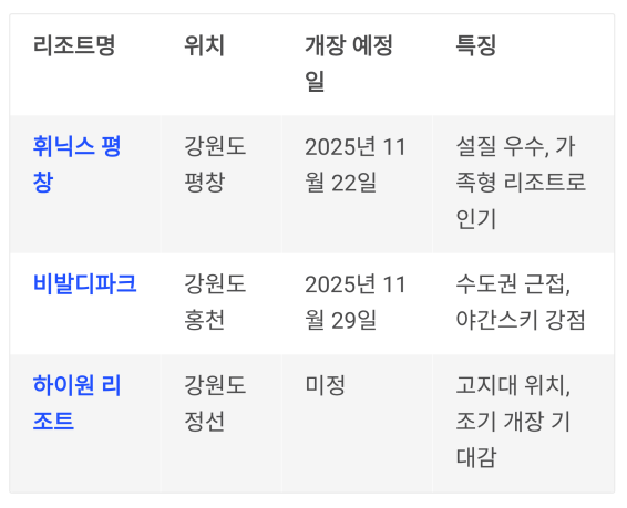 | 휘닉스 평창 | 강원도 평창 | 2025년 11월 22일 | 설질 우수, 가족형 리조트로 인기 |